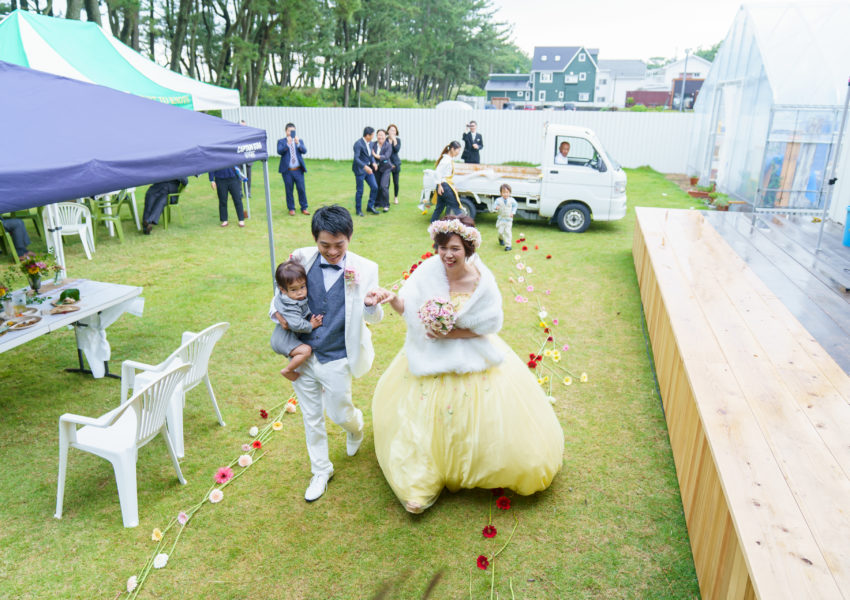 あたたかな塩のカオリと青々とした芝生の中、テントやキャンピングカー、軽トラックを使用した演出も可能。