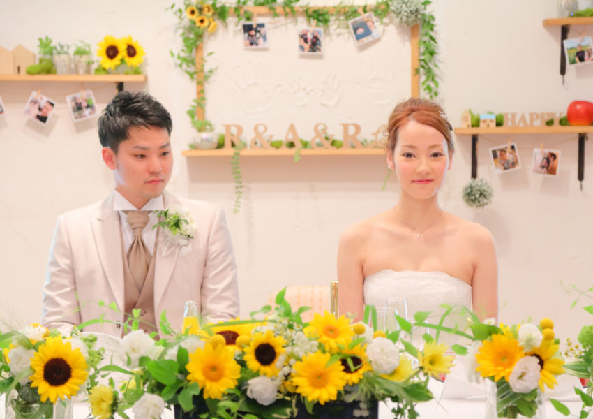 天国から見守っていてくれる彼のお母さんに「よろしくお願いします」の気持ちをとどけたくて、お母さんの大好きだったひまわりをコンセプトに結婚式の準備をしました。